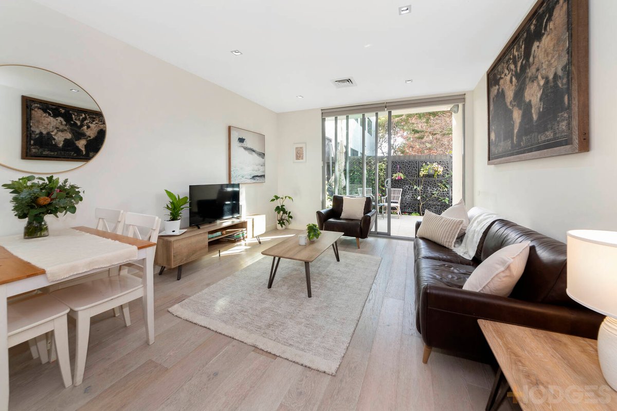 Step in from the cafes, step out to the courtyard, step into life on Bay …within 1km of the bay! Oriented to sea-breezes and afternoon sun in this tightly-held small scale group, this ground-floor two bedroom, two bathroom apartment lights up with living and a master-suite opening through walls of full-height glass to a vast courtyard, while a second bedroom opens to a light-catching central atrium!