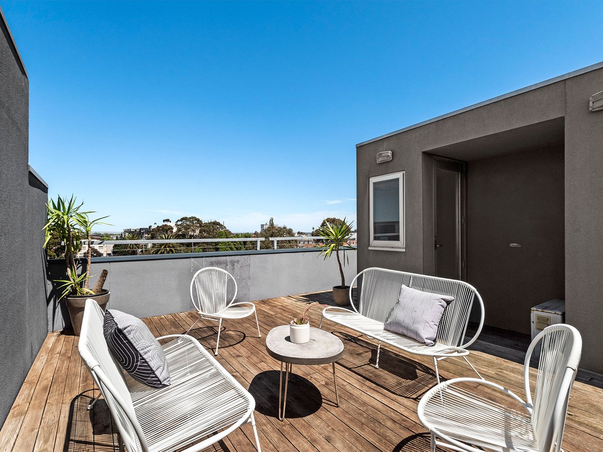 Superb rooftop entertaining terrace perfect for summer evenings with sweeping views of the Palais Theatre and the bay. Light filled first floor living area with sparkling polished floors and private balcony Sleek Bosch kitchen with gas fixtures and a breakfast bar Spacious second floor master bedroom with ensuite and separate study area perfect as a home office. Brand new carpets in both bedrooms, hallways, study and stairs. Ground floor guest bedroom opens onto a tranquil courtyard Excellent main bathroom, internal laundry, air conditioning High ceilings throughout with loads of storage spaces Boutique block of nine apartments, intercom entry, security parking Stroll to Acland St shops, Fitzroy Street bars and the beach Suited for Owner Occupier or Savvy Investor