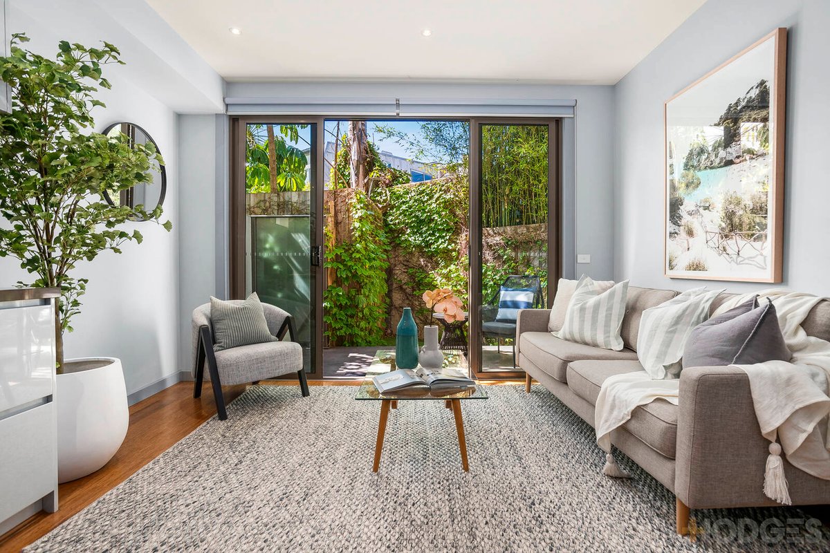 Sophisticated by design with a sleek smoked glass and Miele appliance kitchen, fully-tiled bathrooms and a moody deep-hued decor, the apartment’s interiors are expertly curated with thick stone benchtops, sustainable bamboo floors and streamlined cabinetry. Optioned up with individual reverse-cycle climate control to every room, generous built-in robes and discreet laundry facilities, this lush and lovely garden apartment is superbly secure with video-entry, basement garaging and storage.