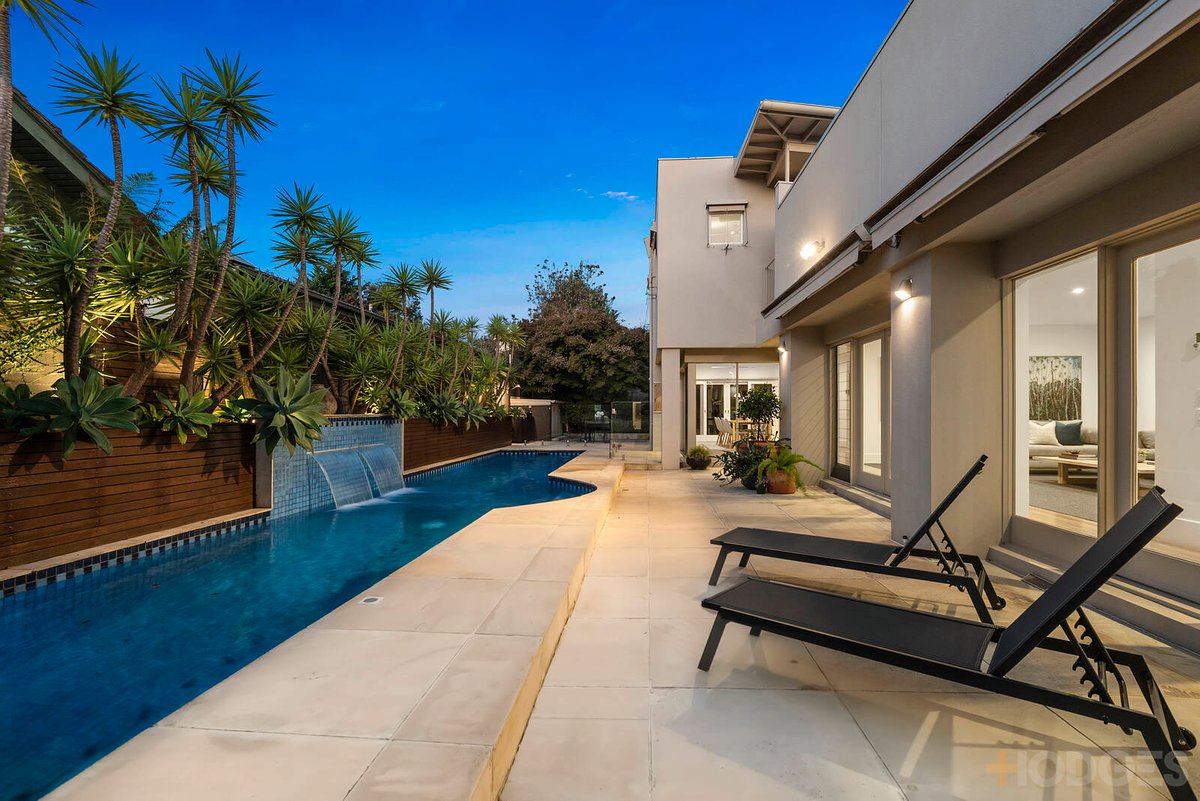 Abundant glazing allows north-facing sunlight to fill the interior, offering seamless ease for alfresco entertaining beside the in-ground solar-heated swimming pool and landscaped, lawned backyard. An opulent main bedroom with lavish ensuite (dual-entry powder room), walk-in robe and large, private sun-terrace is a peaceful retreat, whilst upstairs, the kids' wing offers two robed bedrooms (each with built-in desks and a shared balcony), a bright main bathroom and a carpeted living room.