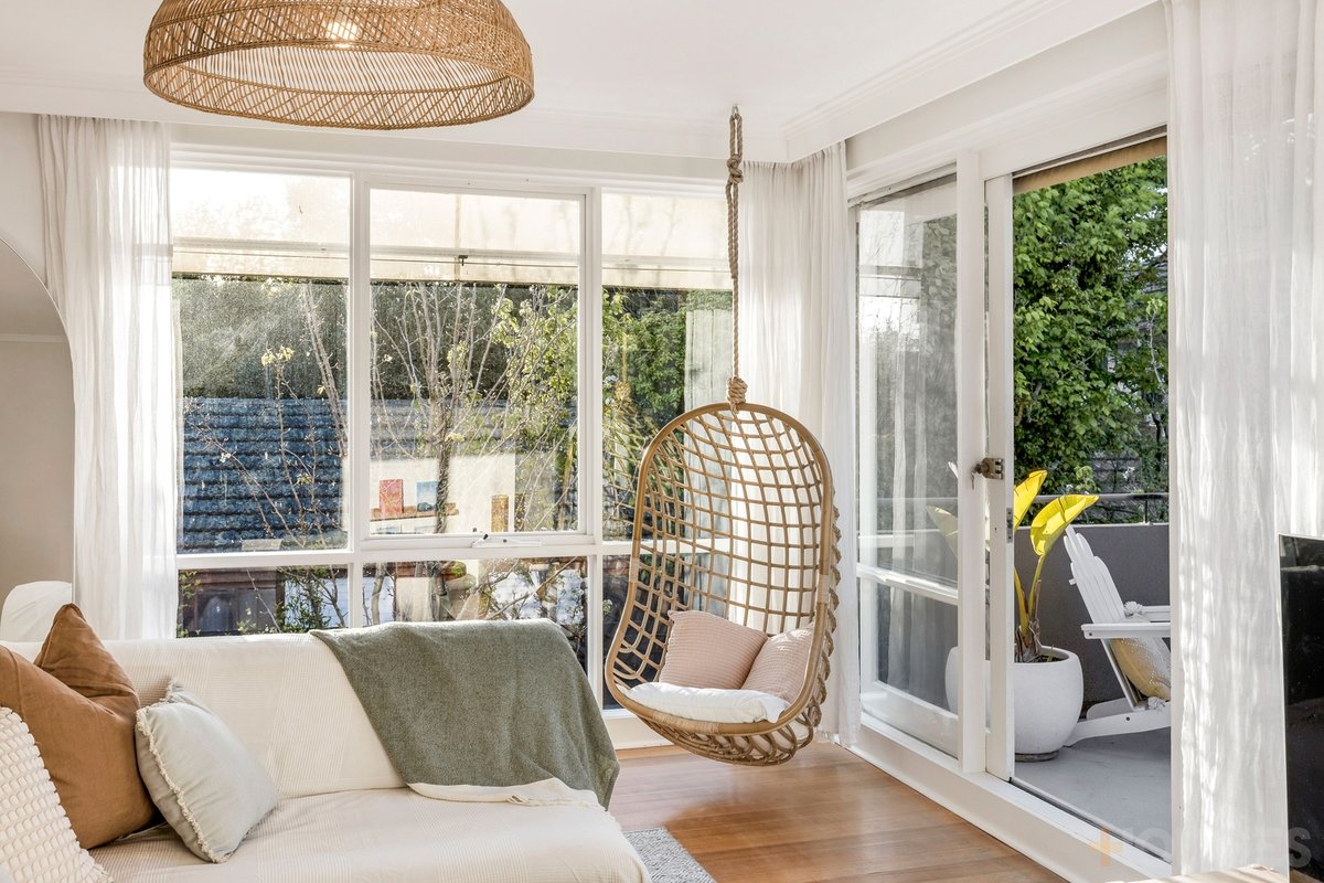 Graciously proportioned with solid hardwood floors and full-height, deep-pelmetted windows as the backdrop to a soft all-white scheme, the home is lit by rattan designer lighting, enclosed by airy sheers (supplemented by external awnings on the sunniest windows), and climate-controlled by multiple reverse-cycle air-conditioners .