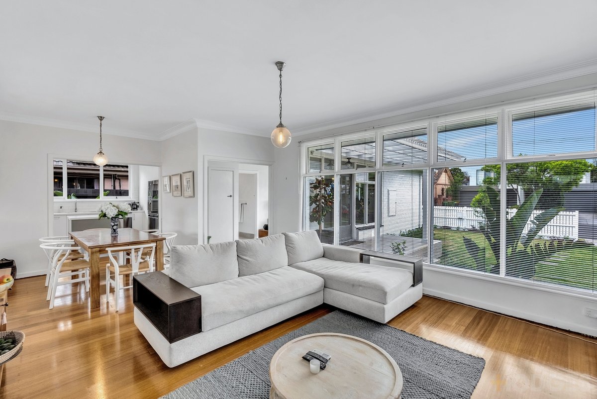 Set behind a crisp white picket fence and neat lawn, a lime-washed deck gives access to the glorious entrance where a stretch of glass lures in streams of sunshine. Warm timber floors lead from here to the generous living room featuring an eye-catching decorative fireplace and flowing through a family-focused dining area to the as-new kitchen topped with chic veined stone and featuring plenty of storage plus stainless steel appliances. Set to the rear is a versatile sunroom looking out to the deep back garden, whilst the two principal bedrooms both feature ceiling fans, the master with ample built-in wardrobing.