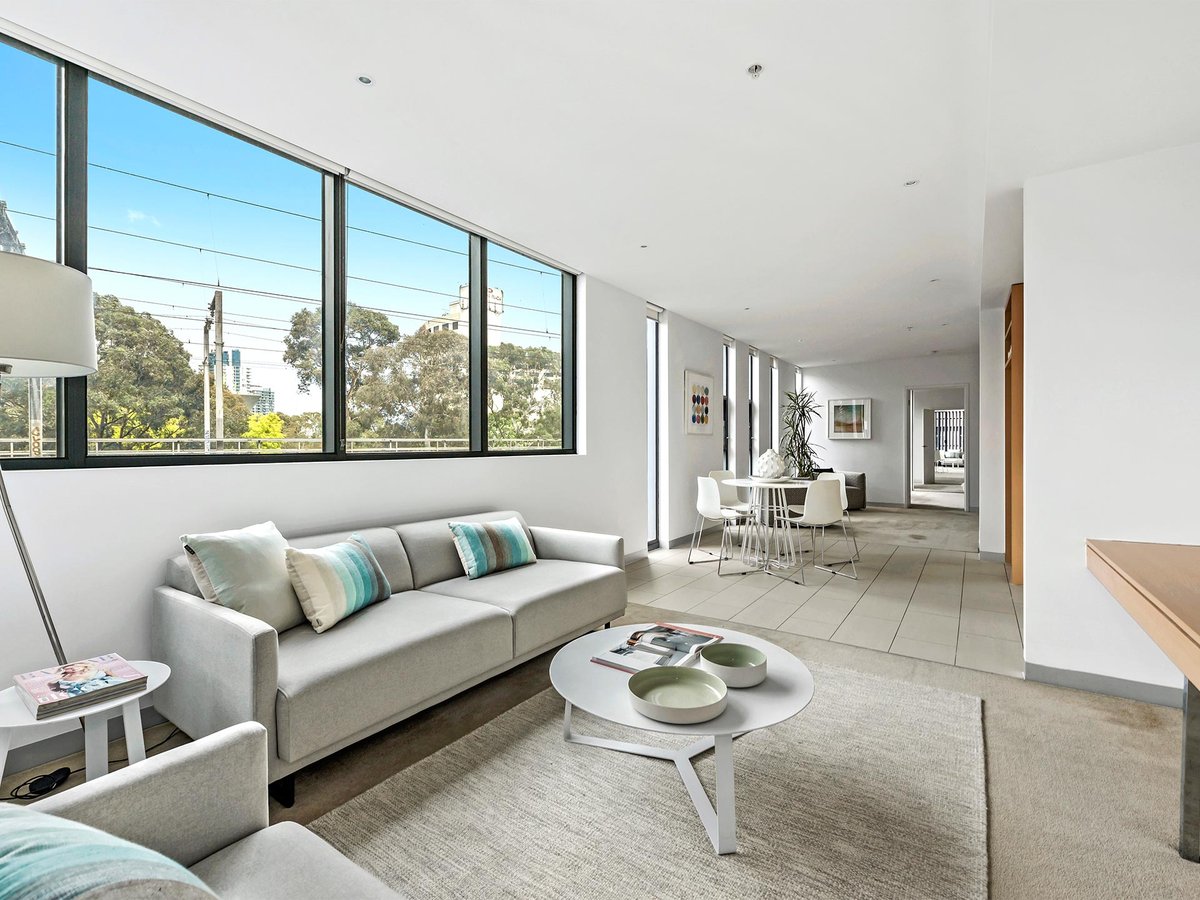 The spacious open plan layout of this modern apartment boasts a dedicated dining area plus two spacious and light filled living areas, with lounge that flows out to the balcony. The master bedroom is king sized and enjoys generous mirrored robes. The second bedroom, which is separated by the central bathroom with euro laundry facilities, is splashed with natural light and is equipped with its own winter garden.