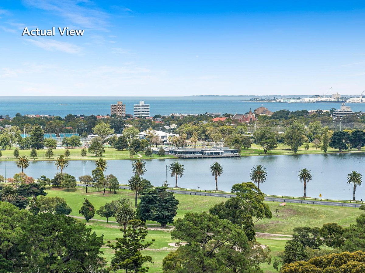 Spectacular panoramic views over Albert Park Lake and Port Phillip Bay surround this sleek corner apartment. Clean lined living areas make the most of the memorable outlooks and are complemented by an inviting balcony and a kitchen equipped with immaculate stone bench tops and stainless steel Smeg appliances.