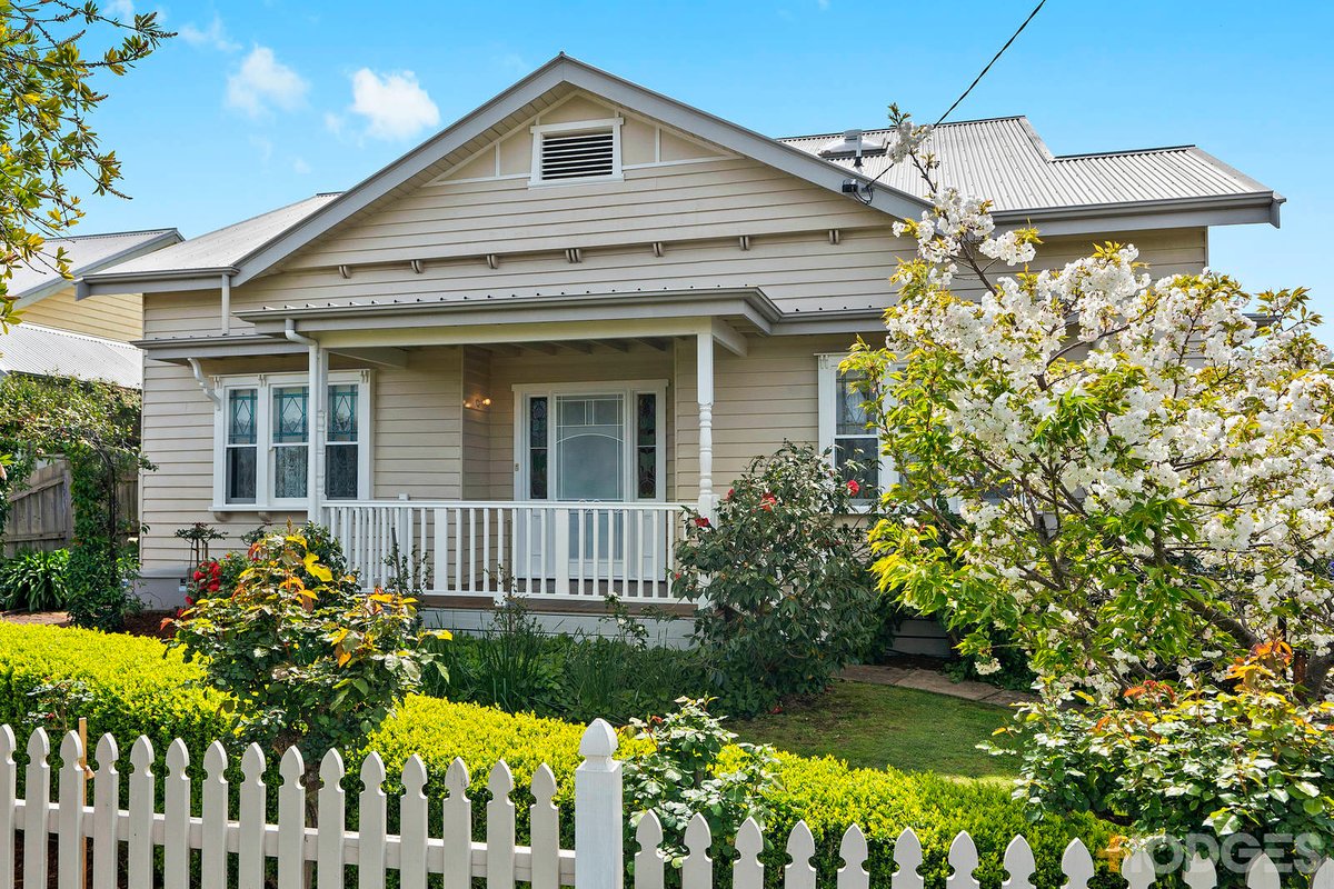 Exclusively situated in a highly sought after pocket just moments to many popular shopping and café strips, this distinctive and much admired period residence displays a captivating blend of period refinement and evocative contemporary style – all within expansive and superbly zoned family dimensions. Beautifully framed by picturesque landscaped gardens, the character-rich exterior is matched by an interior featuring high ceilings and baltic timber floors. The enticing foyer and entrance hall lead to a gracious formal lounge room and three large bedrooms, one with an open fireplace. A family bathroom with clawfoot bath and separate toilet are located off the hall that flows into a commodious open living room warmed by an abundance of northern light and featuring a gourmet kitchen with a light-filled living area large enough for the growing family. Indoor living opens to the stunning private garden with extensive paving, pergola and a BBQ area. A laundry with ample cupboard and bench space flanks the living room. Upstairs, further family accommodation includes bedroom number five with study, and an impressive main bedroom with tasteful ensuite and glimpses over the CBD and Corio Bay. Desirably situated within a short distance to excellent primary and secondary schools, Shannon Avenue, Geelong Train Station and the Melbourne Ring Road, this magnificent family home also includes heating and cooling, a corner location including side access to an auto lock up double garage with 12 rooftop solar panels and inverter, rear access (ideal for a boat, caravan or tradie trailer), rainwater tank, and an abundance of scope to further update and personalise.